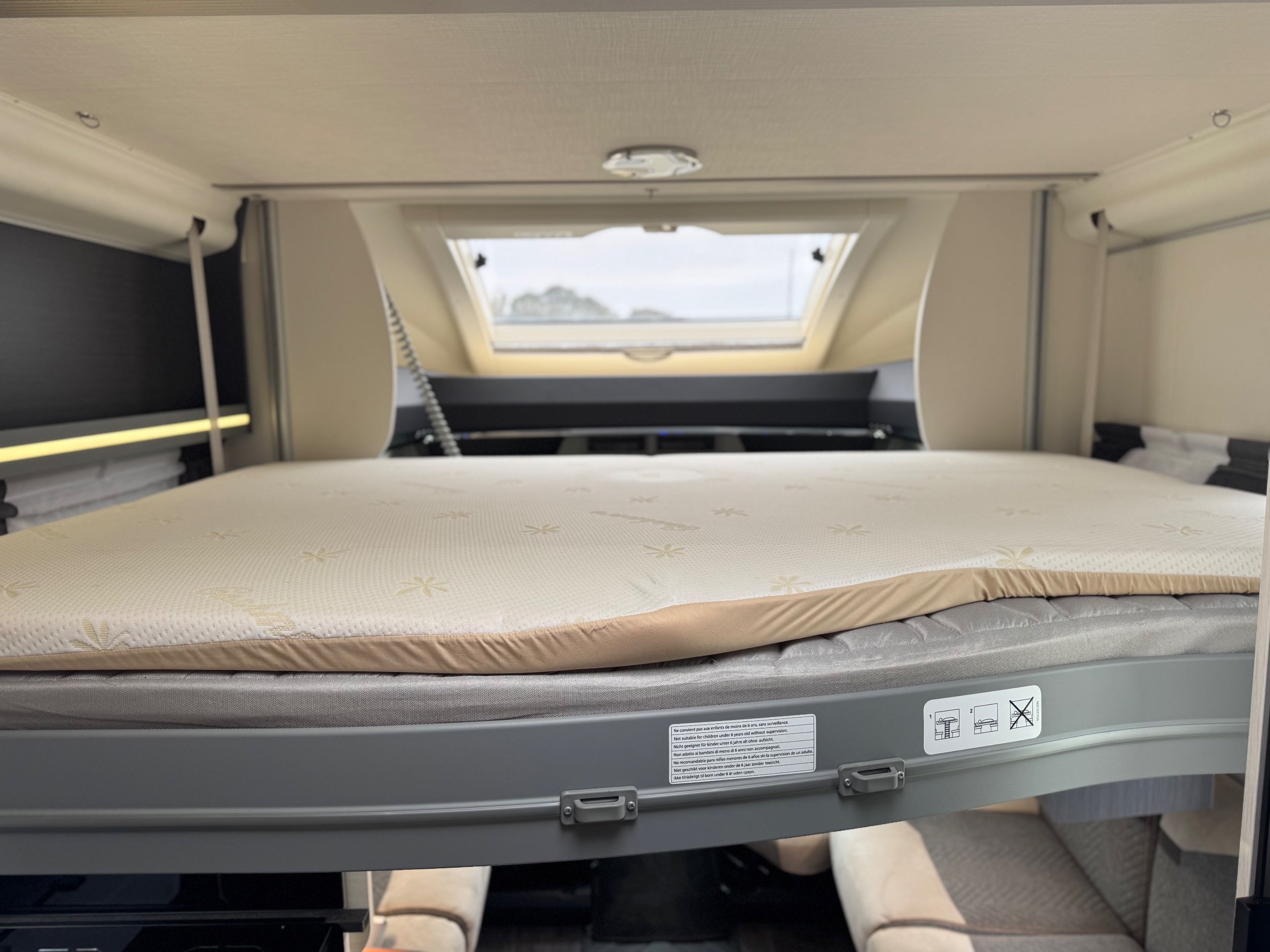 Smart lounge electric drop-down bed, accessible by ladder, retracts into roof when not in use
