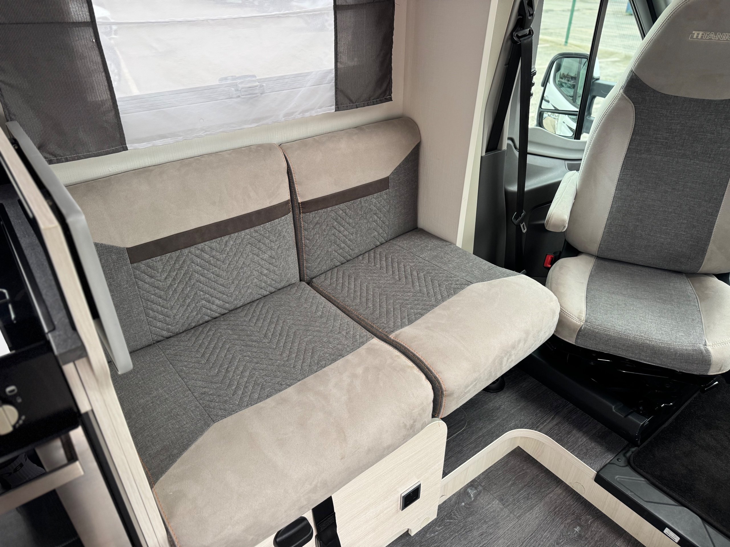 Sofas on both sides transform into belted forward-facing travel seats