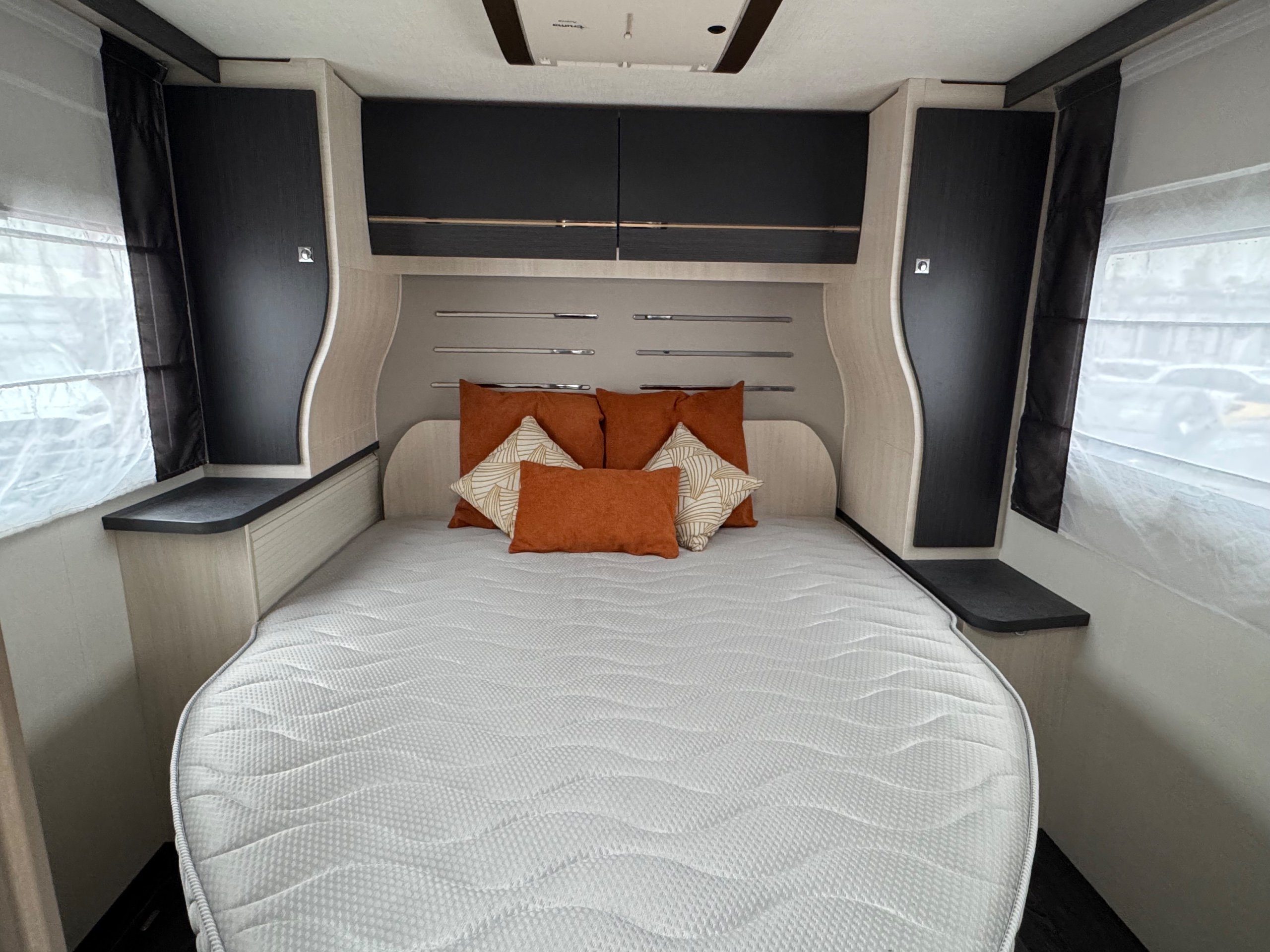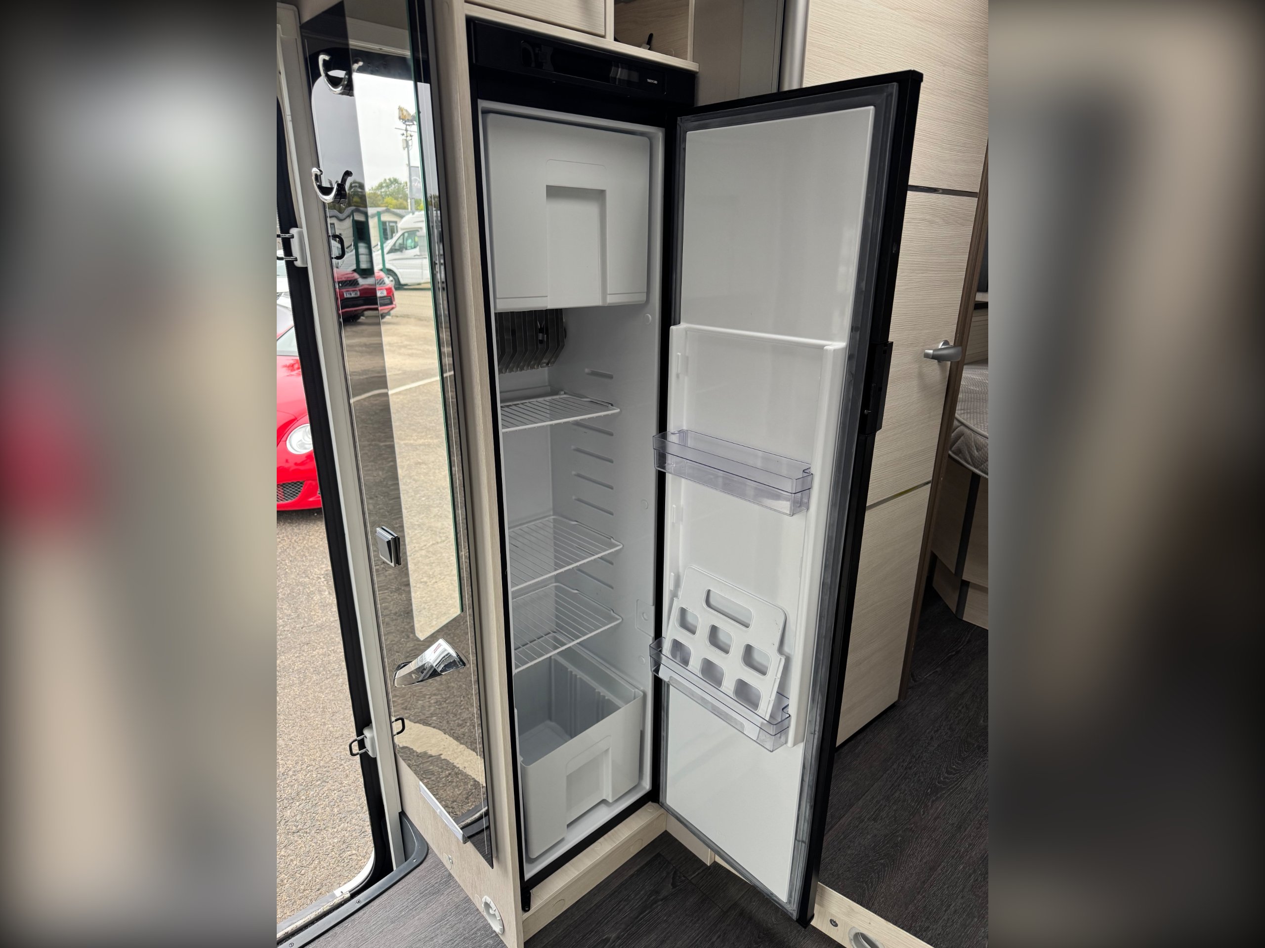 Thetford fridge freezer, cutlery drawer, and ample storage throughout